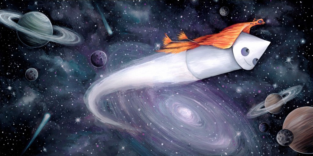 Space Tagged children's book, children's book illustration, children's book spread, childrens book illustration, galaxy illustration, phoenix illustration, phoenix on rocket, planets illustration, rocket illustration, rocket in space illustration, space illustration